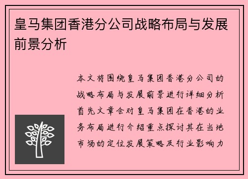 本文将围绕皇马集团香港分公司的战略布局与发展前景进行详细分析。首先,文章会对皇马集团在香港的业务布局进行介绍,重点探讨其在当地市场的定位、发展策略及行业影响力;接着,我们将分析该公司在香港的商业模式和市场竞争力,如何借助品牌效应与全球化资源拓展本地市场;随后,文章会分析皇马集团在香港的投资与并购战略,探讨其如何通过资本运作扩大市场份额;最后,文章将讨论香港分公司在未来的发展前景,分析可能面临的挑战与机遇,预测未来几年的发展趋势。通过这些分析,本文希望全面呈现皇马集团香港分公司的战略布局以及其未来的商业潜力。